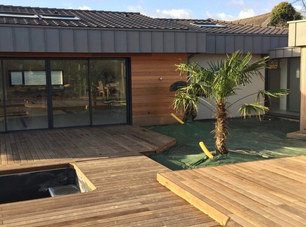 En tant qu’artisan spécialisé en extension et aménagement extérieur, nous réalisons des terrasses en bois attenantes à des ouvertures larges, des baies vitrées et des volumes en toit plat. Nous intervenons sur la pose de platelage bois, la création de socles et gradins, l’intégration d’un espace technique pour bassin ou retraitement d’eau, ainsi que l’habillage en bardage bois ou panneau composite pour une cohérence esthétique. Notre intervention couvre également la mise en œuvre d’une bande d’étanchéité, la finition des bordures et la coordination avec les menuiseries extérieures pour garantir une liaison propre entre la terrasse et la baie vitrée. Pour un projet d’extension légère en ossature bois et toit plat, nous pouvons concevoir l’ossature, poser l’isolation et assurer la couverture en zinc ou en membrane adaptée selon l’architecture existante. Nous réalisons les relevés, étudions l’accès chantier et adaptons nos méthodes pour limiter les nuisances et préserver l’environnement paysager.